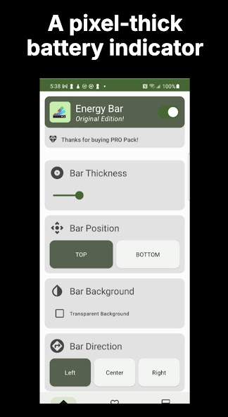 ✓ Energy Bar kann aus einer Breite von 1 Pixel konfiguriert werden, um die gesamte Statusleiste (Pro) abzudecken.
